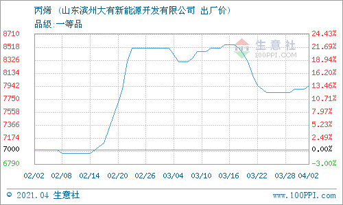 4月2日,山東濱州大有新能源開(kāi)發(fā)有限公司丙烯最新報(bào)價(jià)上調(diào),漲50元/噸至7950元/噸。