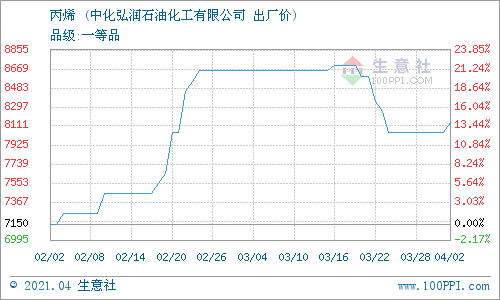 4月2日,中化弘潤石油化工有限公司丙烯報價上調,漲100元/噸至8150元/噸。