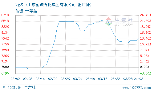 4月2日,山東金誠(chéng)石化集團(tuán)有限公司丙烯最新報(bào)價(jià)上調(diào),漲70元/噸至7950元/噸。
