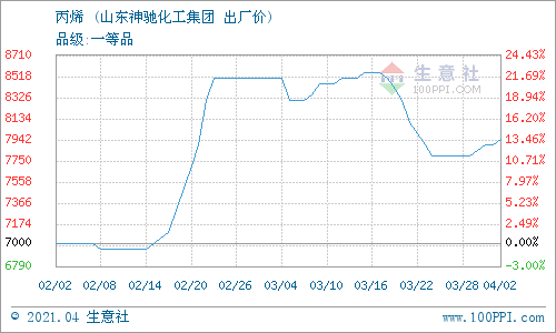 4月2日,山東神馳化工集團(tuán)丙烯最新報(bào)價(jià)上調(diào),漲50元/噸至7950元/噸。