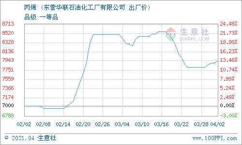 4月2日,東營華聯(lián)石油化工廠有限公司丙烯最新報價上調(diào),漲50元/噸至7953元/噸。