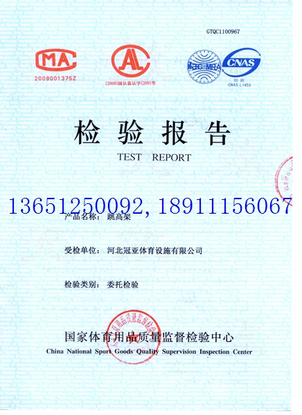 立柱應(yīng)垂直場面,垂直公差不大于1/800,其高度刻度應(yīng)精確、清晰,兩立柱高度刻度應(yīng)對稱;跳高架應(yīng)超過橫桿實際提升高度100mm;橫桿采用不易折斷的玻璃鋼纖維材料制成;除兩端外,橫桿橫截面是圓形,橫桿顏色醒目,表面無毛刺,所有棱邊和尖角半徑6mm;橫桿固定在立桿上,中心自然下垂20mm;橫桿托能牢固地固定在立柱的刻度內(nèi),橫桿托上沒有包裹橡膠或其他能夠增大與橫桿之間摩擦力的任何物質(zhì),亦沒有使用任何各類的彈簧,進行跳高運動時,碰觸橫桿,橫桿容易掉下。