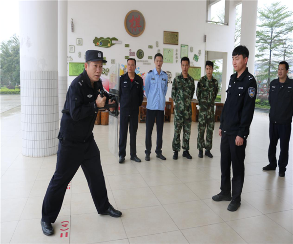 演練之前,警官向老師、校警簡單介紹了盾牌,警棍以及鋼叉的使用方法和配合技巧,在熟悉了工具以后展開了防暴演練。學(xué)校老師模擬“歹徒”闖入校園,校園發(fā)出警報,在課室的學(xué)生們關(guān)緊門窗,書包護頭,老師拿工具頂門。同時,出動校警,老師阻止“歹徒”進入校園。在師生的共同努力下,成功制服“歹徒”。