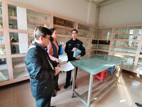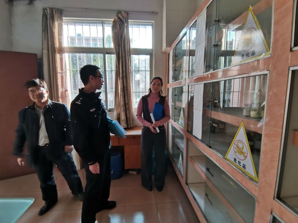 12月20日下午,東鳳鎮(zhèn)橫瀝派出所劉所長(zhǎng)、教指中心黃美英老師等到東鳳二中進(jìn)行易制毒、易制爆等危險(xiǎn)化學(xué)品的安全檢查與指導(dǎo)工作。東鳳二中胡發(fā)良副校長(zhǎng)、總務(wù)處顧永進(jìn)主任、化學(xué)備課組老師、實(shí)驗(yàn)室負(fù)責(zé)人陪同檢查。