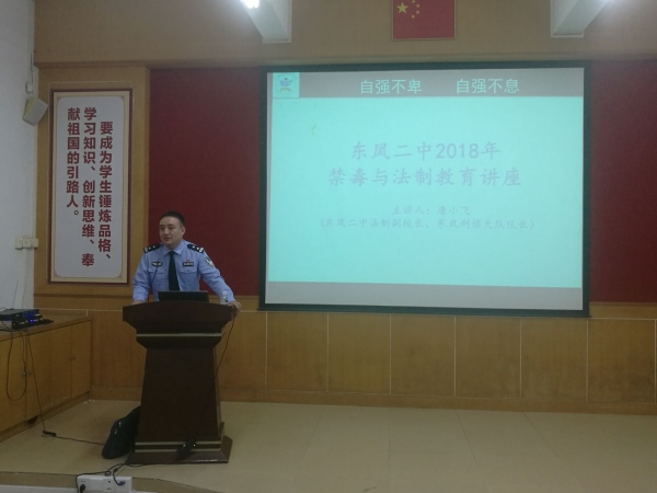 為了進(jìn)一步提高學(xué)生禁毒意識(shí),增強(qiáng)學(xué)生抵制毒品的能力。東鳳二中在11月28日下午在階梯室舉行了禁毒知識(shí)講座,本次講座邀請(qǐng)了東鳳二中駐校法制副校長(zhǎng)、東鳳鎮(zhèn)公安分局刑偵隊(duì)大隊(duì)長(zhǎng)唐小飛同志主講,胡發(fā)良副校長(zhǎng)主持并發(fā)表總結(jié)。