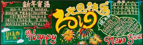 本次活動(dòng)得到了全校師生的積極響應(yīng),在2019年元旦到來之前,全部完成任務(wù)。各班級(jí)發(fā)揮聰明才智,精心選材,細(xì)心安排,各個(gè)班級(jí)設(shè)計(jì)的黑板報(bào)主題鮮明、版面豐富,同學(xué)們用靈巧的手、用多彩的畫筆在這小小的方寸之間綻放光彩,描繪出同學(xué)們對(duì)新年的憧憬,為校園增添了新年的光彩。