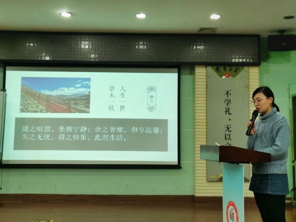 身處兩地,心有共鳴,班級(jí)管理異曲同工。王淼老師、熊艷老師隨后分別代表外派至四川成都、安徽進(jìn)行學(xué)習(xí)考察的班主任團(tuán)隊(duì)進(jìn)行經(jīng)驗(yàn)見聞分享。王淼老師說起成都的山水人文環(huán)境,以哲理性的感悟“人生一世,草木一秋”開篇,緊扣班主任專業(yè)成長(zhǎng)的幸福密碼進(jìn)行了充滿詩(shī)性、哲思的分享。在忙碌的工作和學(xué)習(xí)中,我們因何忙?如何做到忙而有思,忙中有得?王淼給出自己的思考——“動(dòng)則生,靜則樂”,高度提煉了班主任的理想工作和生活態(tài)度。熊艷老師的介紹在濃濃的徽派建筑藝術(shù)氛圍中展開,熊艷老師將拍攝的實(shí)地圖片一一鋪展開來,讓我們看見了徽地學(xué)校的精神文化面貌,更讓我們對(duì)參觀學(xué)校課程育人的特色及其落于實(shí)地的實(shí)施辦法與路徑印象深刻?!坝恕笔且粭l任重道遠(yuǎn)的崇高道路,熊艷老師呼吁老師們“以生為本、師德為先、能力為重、終身學(xué)習(xí)”,令人振奮。