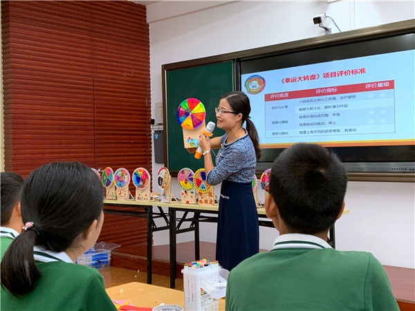 本次活動(dòng),首先是STEAM課例《幸運(yùn)大轉(zhuǎn)盤》現(xiàn)場(chǎng)展示。科學(xué)麥金梅老師引導(dǎo)學(xué)生分小組制定研究計(jì)劃,分解制作項(xiàng)目,設(shè)計(jì)轉(zhuǎn)盤的草圖;科學(xué)朱偉明老師把三角形穩(wěn)定性原理應(yīng)用到轉(zhuǎn)盤支撐結(jié)構(gòu),形成牢固底座;實(shí)踐輪軸原理,擰螺絲固定;運(yùn)用熱熔膠受熱融化,冷卻凝固粘合各零部件等科學(xué)知識(shí),指導(dǎo)學(xué)生組裝一個(gè)完整且牢固的幸運(yùn)裝盤。