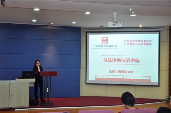 本次培訓(xùn)活動(dòng)分為兩個(gè)環(huán)節(jié):頒發(fā)法律顧問(wèn)聘書(shū)和開(kāi)展普法講座。首先,德育處郭楊德主任簡(jiǎn)單介紹了受聘律所廣東國(guó)融律師事務(wù)所的基本情況,并向全體老師介紹了兩位受聘律師:唐國(guó)雄主任律師、唐麗斌律師的專業(yè)專長(zhǎng)以及可為本校提供的相關(guān)法律服務(wù)范圍。接著,由歐淑霞校長(zhǎng)為兩位律師頒發(fā)法律顧問(wèn)聘書(shū)。