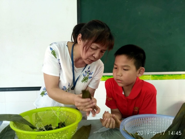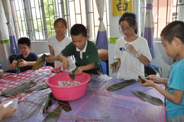 最直觀的是五年級(jí),帶領(lǐng)著孩子們親力親為,動(dòng)手做傳統(tǒng)美食——粽子。家長(zhǎng),老師和孩子齊動(dòng)手,畫面非常和諧??諝庵酗h蕩著陣陣粽香,讓參觀的學(xué)生老師垂涎三尺,一時(shí)間個(gè)個(gè)變身小吃貨,大飽口福。