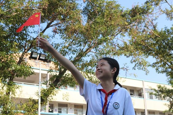 隨后,高年級組織隊員們進行“我和國旗合個影”活動。隊員們手舉五星紅旗,擺成五角星、圓圈等隊形,與國旗一起留下燦爛的笑容。