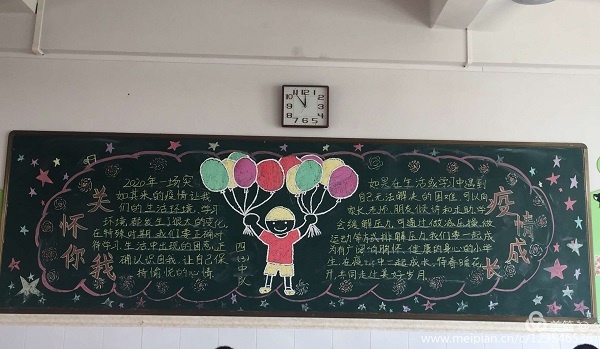 此次活動(dòng),全體師生積極參加,用心準(zhǔn)備。同學(xué)們都能積極參與。在老師的指點(diǎn)下,各班負(fù)責(zé)黑板報(bào)的同學(xué)們采用多種途徑查閱、收集有關(guān)新冠肺炎的資料,精心選材并設(shè)計(jì)方案,仔細(xì)書(shū)寫(xiě)、細(xì)致描畫(huà),創(chuàng)作出了一幅幅主題鮮明、內(nèi)容豐富、圖文并茂、形式新穎的優(yōu)秀板報(bào)作品,按期完成了“關(guān)懷你我,‘疫’境成長(zhǎng)”的黑板報(bào)宣傳活動(dòng)。雖然有些同學(xué)并不是十分懂得繪畫(huà)的技巧,但是他們?nèi)匀慌⑺辛λ芗暗氖虑樽龊?。例如他們?zhēng)著出主意,精神抖擻地站在一旁隨時(shí)做好遞接的協(xié)助工作。