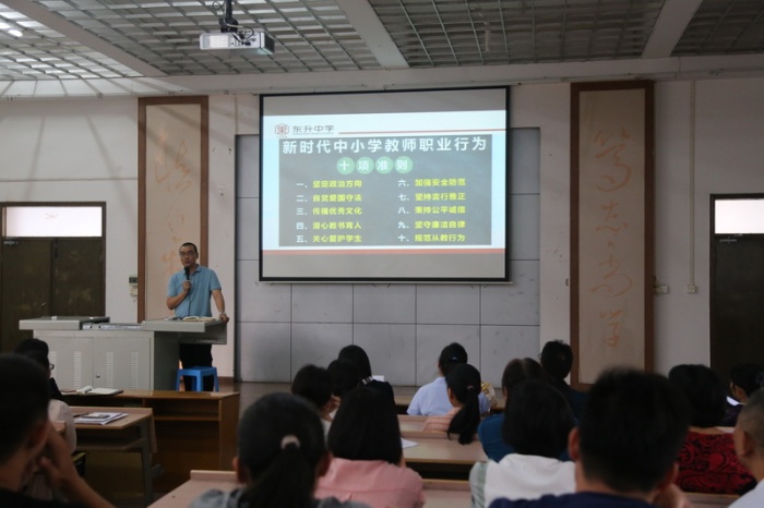 10月10日下午,東升中學(xué)召開了強(qiáng)化師德師風(fēng)建設(shè)的教師會(huì)議。校長吳耀光作了專題談話,引領(lǐng)全體教師重溫了《教師法》和《新時(shí)代中小學(xué)教師行為十項(xiàng)準(zhǔn)則》。通過學(xué)習(xí),老師們普遍增強(qiáng)了師德師風(fēng)建設(shè)的認(rèn)識(shí)。