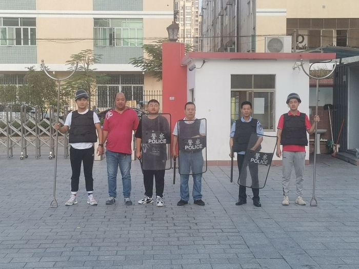 8:30,演習開始:門口有不明人員企圖混進校園,保安阻止無效,危險升級,歹徒手持菜刀,恐嚇要挾闖進校園,一名保安馬上拿起盾牌、警棍格擋,另一名老師手持鋼叉牽制,并迅速按響“一鍵警鳴”,兩名保安合力把歹徒逼到校園無人一帶,牽制歹徒,保安與老師合力把歹徒制服,危險解除,演練完畢。