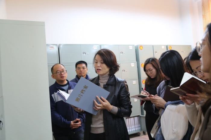 第一階段,與會活動人員集中到東升中學檔案館進行實物參觀。梁老師就東升中學檔案布局、實物陳列以及文本文檔應該如何擺放陳列,以及檔案室管理進行了現(xiàn)場指導講解。她提醒參觀人員,檔案陳列擺放以及檔案室管理要做到細致規(guī)范。就各中小學檔案管理員提出的問題,梁老師給予了細致解答。
