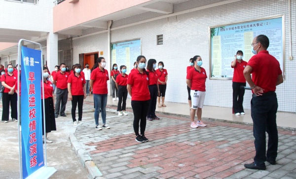 培訓結束后,在學校疫情防控領導小組的帶領下,全體教職工在校園里開展疫情應急處置演練。演練前,白云山副校長對演練的內容、步驟、流程、分工等進行了詳細介紹,確保演練活動順利進行。演練在冼校長的宣布下拉開了帷幕!本次演練共設四個場景,分別是早晨進校情況演練、上課突發(fā)事件情況演練和學生就餐情況演練。演練主要模擬在這三個場景中有學生突然出現(xiàn)身體異常,值日老師或上課老師全過程處置流程,包括:老師隔離報告、衛(wèi)生管理員核實登記、班主任聯(lián)系家長、班主任跟蹤匯報、保潔員進行清潔消毒、學校領導上報等。整個演練過程嚴格按照學校應急預案規(guī)定流程進行,相關部門分工明確、反應迅速、協(xié)調有序,銜接順暢。演練結束后,冼校長對在演練過程中出現(xiàn)的一些細節(jié)問題,提出了優(yōu)化建議,進一步完善了學校防控工作應急預案,為復學后的疫情防控工作打下了扎實基礎。
