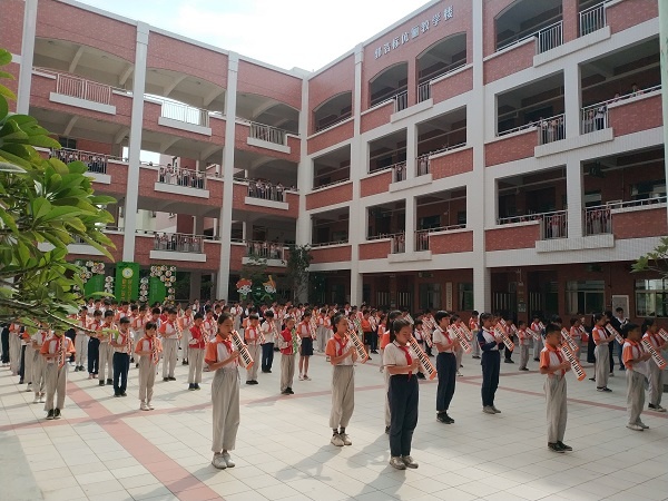 是日上午約10時(shí)50分,鎮(zhèn)督導(dǎo)評(píng)估小組如約而至。在裕民小學(xué)校長(zhǎng)羅東的帶領(lǐng)下,鎮(zhèn)督導(dǎo)小組參觀了該校口風(fēng)琴、書(shū)法、版畫(huà)等體藝特色項(xiàng)目的展示表演。鎮(zhèn)督導(dǎo)評(píng)估小組成員一進(jìn)校門(mén),一陣陣表示熱烈歡迎的掌聲響起。之后,一樓天井、二樓、三樓,排成整齊隊(duì)列靜候的孩子們開(kāi)始了他們期待已久的展示表演。先是口琴演奏,在口琴社團(tuán)老師的引領(lǐng)下,一首優(yōu)美的歌曲就在大家周身縈繞、流淌而過(guò)。完畢,架子鼓聲中,席地而坐的小小口風(fēng)琴“演奏家”們站起排成隊(duì)列開(kāi)始演奏他們?cè)缇蜏?zhǔn)備好的“友誼花開(kāi)萬(wàn)里香”??粗⒆觽兡钦R的隊(duì)伍,聽(tīng)著那悠揚(yáng)的琴聲,觀者贊嘆不已。連那大堂內(nèi)等待派飯的阿姨們都禁不住拿起手機(jī)拍下視頻。接著,鎮(zhèn)督導(dǎo)評(píng)估小組們拾級(jí)上了三樓,參觀書(shū)法社團(tuán)、版畫(huà)社團(tuán)孩子們的展示??粗⒆觽儎倓偝善返囊环髌罚蠹叶钾Q起了大拇指——孩子們真棒!四樓主要是圍棋、校園劇、古箏、卡宏鼓等社團(tuán)的展示。孩子們表現(xiàn)特別棒,贏來(lái)一片“嘖嘖”的贊嘆聲。最后,羅東校長(zhǎng)與鎮(zhèn)督導(dǎo)評(píng)估小組一行來(lái)到了綠茵場(chǎng)上參觀了該校的棒球、足球特色展演。孩子們出色的表現(xiàn)又贏得了一片贊賞之聲。
