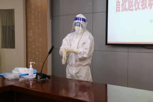 在吳校長(zhǎng)講話之后,東升醫(yī)院婦產(chǎn)科黎雪玲護(hù)士長(zhǎng)和葛香萍護(hù)士還為與會(huì)人員現(xiàn)場(chǎng)親自演示了“七步洗手法”和“防護(hù)服正確穿脫法”。