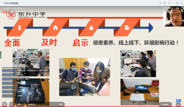 為進(jìn)一步落實疫情期間“停課不停學(xué)”要求,順利推進(jìn)在線課程教學(xué),把脈問診“線上教學(xué)”中存在的問題,分享交流成功的經(jīng)驗做法,2020年3月18日下午,東升鎮(zhèn)教育事務(wù)指導(dǎo)中心通過釘釘網(wǎng)絡(luò)平臺召開全鎮(zhèn)線上教育交流研討視頻會議。東升鎮(zhèn)教育事務(wù)指導(dǎo)中心張宏齊主任、各教研員、全鎮(zhèn)四所中學(xué)的校長和全體行政均參加了會議。會議由東升中學(xué)教導(dǎo)處唐紅波主任主持,東升鎮(zhèn)教育事務(wù)指導(dǎo)中心張宏齊主任作總結(jié)講話。