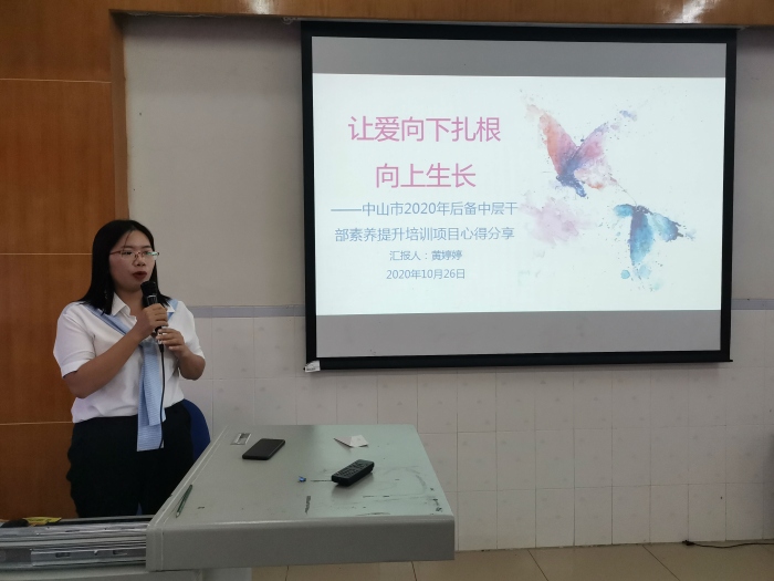 為夯實(shí)中山市中小幼學(xué)校后備中層干部人才,提高干部隊(duì)伍整體素質(zhì),來自中山市各中小幼學(xué)校的30位教師前往華南師范大學(xué)參加為期6天的中山市2020年后備中層干部素養(yǎng)提升培訓(xùn)項(xiàng)目。10月26日下午,中山市阜沙鎮(zhèn)豐聯(lián)小學(xué)黃婷婷主任與全體教師分享了在中山市2020年后備中層干部素養(yǎng)提升培訓(xùn)項(xiàng)目中的心得體會(huì),共同交流討論教育工作者應(yīng)如何實(shí)現(xiàn)職業(yè)理想與幸福。