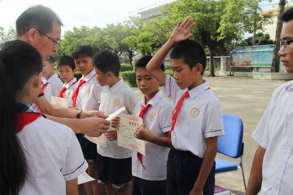 接下來,讓學(xué)生們緊張又興奮的頒獎(jiǎng)環(huán)節(jié)到了。學(xué)校行政分別為在德、智、體、美、勞各方面有優(yōu)異成績,在學(xué)習(xí)、紀(jì)律、文明禮儀等方面都表現(xiàn)突出的先進(jìn)學(xué)生進(jìn)行頒獎(jiǎng)。鄧留兵同學(xué)獲中山市優(yōu)秀少先隊(duì)員稱號;學(xué)校足球隊(duì)在阜沙鎮(zhèn)2019年足球聯(lián)賽中獲小學(xué)組亞軍;楊浩等12名學(xué)生獲得三好學(xué)生;李妍琪等12名學(xué)生獲得優(yōu)秀班干部......校園里不時(shí)響起陣陣熱烈的掌聲,為這些努力進(jìn)取的同學(xué)們送上肯定和贊揚(yáng)。在頒獎(jiǎng)結(jié)束后,學(xué)校還在本次散學(xué)禮上進(jìn)行了響應(yīng)“決戰(zhàn)脫貧攻堅(jiān),助力鄉(xiāng)村振興”的廣東扶貧濟(jì)困日捐款儀式。師生們紛紛進(jìn)行捐款,傳遞愛心,營造希望。