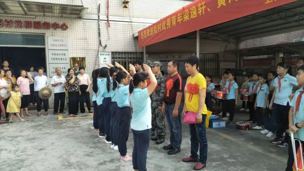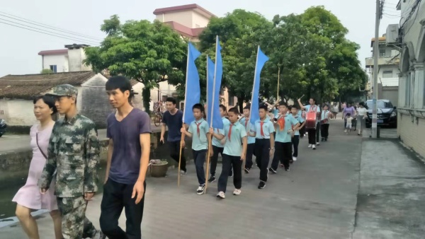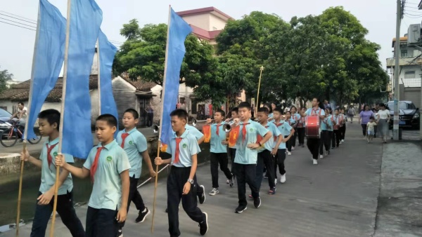 2019年9月12日,潤紅的嬌陽為晴天添加了一抹色彩。牛角小學(xué)小學(xué)的鼓號隊員滿懷激情地來到阜沙鎮(zhèn)牛角村和衛(wèi)民村村府參加送軍儀式。
