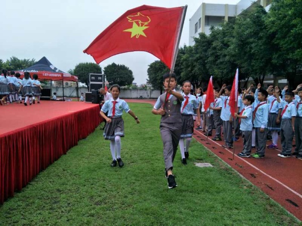 伴隨著嘹亮的隊歌,一年級200多名新隊員被批準加入中國少年先鋒隊,成為一名光榮的少先隊員,在雄壯有力的出旗曲中,少先隊旗手與護旗手們邁著整齊的步伐,精神抖擻地進行著莊嚴的出旗儀式,少先隊入隊儀式由此拉開帷幕。