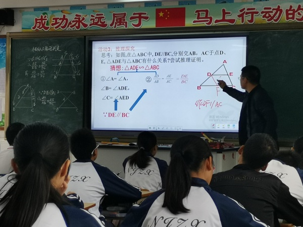 活動(dòng)第一環(huán)節(jié)由牛角中學(xué)溫許錫副校長(zhǎng)為大家呈現(xiàn)課改創(chuàng)投展示課例——《相似三角形的判定(1)》。溫校長(zhǎng)首先復(fù)習(xí)相似三角形的性質(zhì),然后自然地過渡到相似三角形的判定的探究,一步步循循善誘,引導(dǎo)學(xué)生探究?jī)蓷l直線被三條平行線所截時(shí)產(chǎn)生的幾條線段的關(guān)系,讓學(xué)生明了了定理和推論的生成過程。整節(jié)課設(shè)計(jì)合理,層層深入,教師表述嚴(yán)謹(jǐn),書寫規(guī)范。