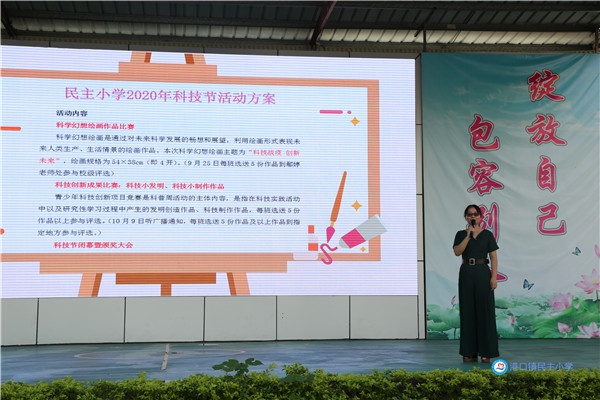 濃情九月,碩果飄香。為全面貫徹落實《全民科學素質行動計劃綱要》精神,在全校大力普及科學知識,弘揚科學精神,形成學科學、愛科學、用科學的良好氛圍,2020年9月21日上午,民主小學全體師生齊聚學校操場,舉行“科技 創(chuàng)新 體驗 成長”為主題的2020學年科技節(jié)啟動儀式?;顒佑捎帑愒防蠋熤鞒?。