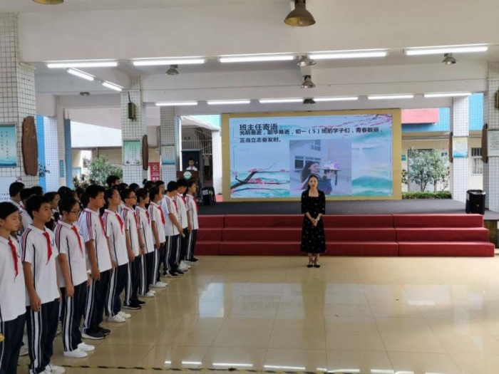 有的班級熱愛古詩詞,展示出了他們的詩歌底蘊(yùn);有的班級擅長傳統(tǒng)民樂器,葫蘆絲現(xiàn)場伴奏,樂音裊裊;有的班級充滿書香文化氣息,同學(xué)們站得筆直,氣質(zhì)出眾;有的班級渴望如雄鷹高飛,表現(xiàn)出他們力爭上游的決心;孩子朝氣蓬勃,充滿活力。稚嫩的初一新生,身上有一股不服輸?shù)膭牛杭w宣誓時聲音一班比一班高;比拼才藝,哪個班都不甘示弱,新生們?nèi)诵∧懽哟?,個人獨唱、民族舞個人秀、街舞表演等才藝表演隨手拈來;各個班級著裝整齊,系著鮮艷的紅領(lǐng)巾大聲說出對自己的期望、對老師的感謝、對父母的感恩、對祖國的熱愛……