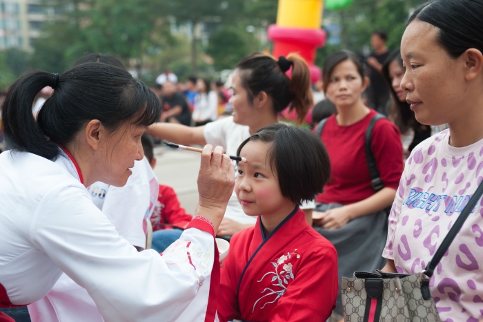 古人云:“童蒙之學(xué),始于衣冠;先正衣冠,后明事理”。家長們首先為孩子們整理衣冠,使孩子心中有了塑造清明心智的第一意識。接著,中心小學(xué)垂髫學(xué)童拱手拜孔子像,鞠躬敬老師,謝師恩。資深老師們逐個為孩子們點朱砂,眉心之間輕輕一摁,一點朱砂如智慧天眼印在孩子們的額頭上,寓意孩子們踏入智慧啟迪的大門。帶著對未來的無限向往,孩子們在激昂鏗鏘的鼓聲中擊鼓明志,告別蒙昧,揚帆起航。學(xué)校肖煒林老師為孩子們示范書寫“人”字。家長們握著孩子的手,飽蘸濃墨,在紙張上一撇一捺共同寫下一個“人”字,希望每個孩子都能盡其一生去認真書寫自己的人生篇章。