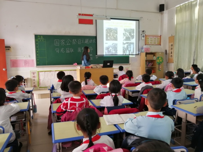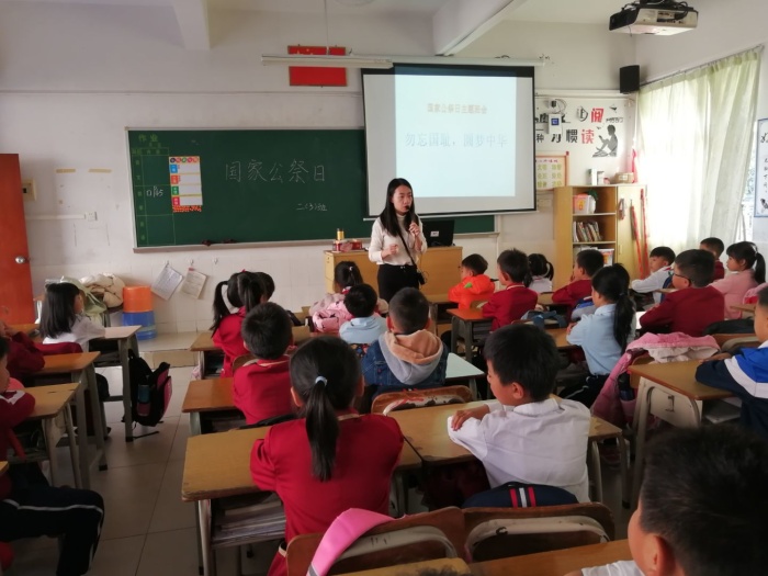 上午肖歡老師進行國旗下演講,警示師生勿忘歷史,號召全體學生為實現中國夢的偉大理想和目標不懈努力。下午,各中隊輔導員結合南京大屠殺和公祭日認真組織主題班會活動。通過觀看有關烈士紀念日和全國公祭日的視頻、觀看一張張南京大屠殺的血腥圖片,一幕幕慘絕人寰的史實畫面,同學們牢記這段痛苦的回憶,也更加深刻的了解了“國家公祭日”的內涵。同學們通過集體詩歌朗誦、高唱國歌,喊出了中華民族憤慨的聲音,激起了強烈的愛國主義情感。