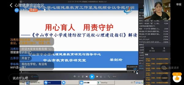 本次直播培訓(xùn)的內(nèi)容豐富,馮主任首先說(shuō)明了學(xué)生返校在即,全體教師都要高度重視學(xué)生返校心理建設(shè),強(qiáng)調(diào)了對(duì)孩子返校心理建設(shè)是學(xué)校近期工作的重點(diǎn),與每一個(gè)老師密切相關(guān),號(hào)召全體教師共同學(xué)習(xí),齊心合力開(kāi)展好學(xué)生的返校心理健康教育。接著馮主任傳達(dá)了《中山市中小學(xué)疫情防控下返校心理建設(shè)指引》的文件精神,并借助中山市教學(xué)研究室梁劍玲老師的《用心育人 用責(zé)守護(hù)》專(zhuān)題講座,讓全體老師認(rèn)識(shí)到如何開(kāi)展好疫情防控下的學(xué)生心理健康教育。