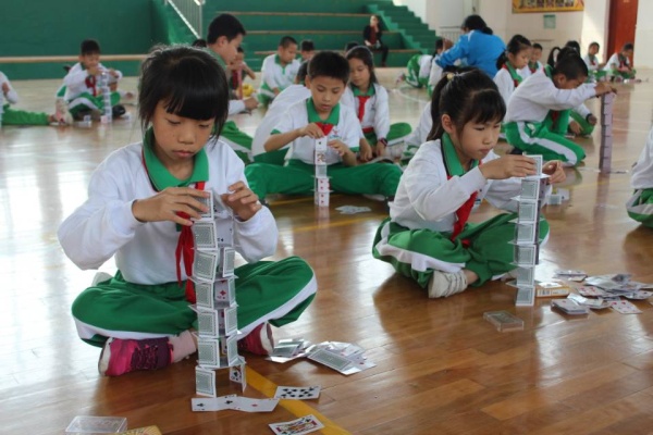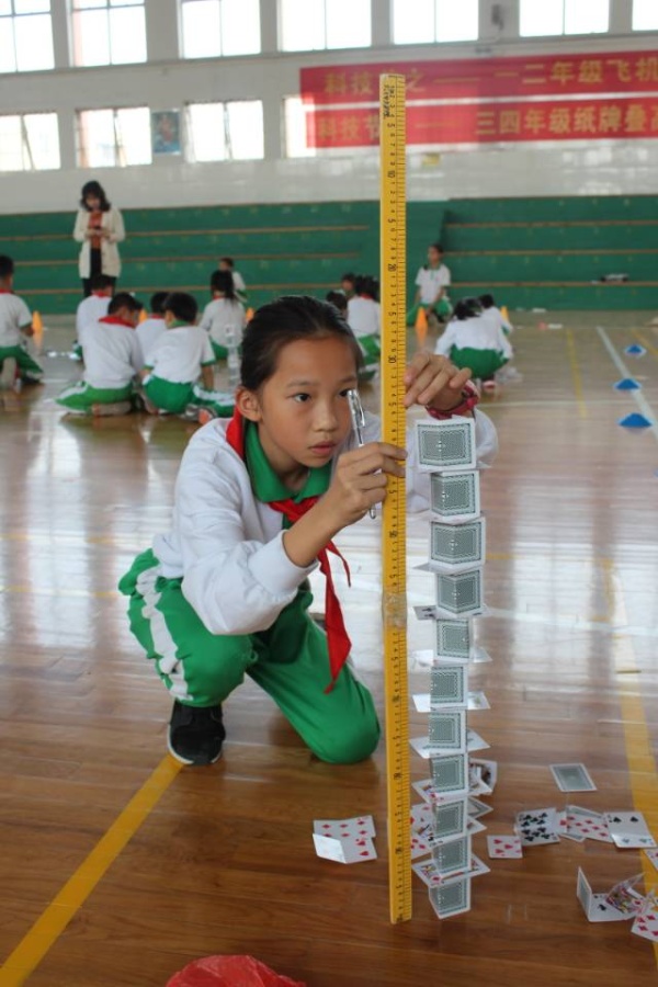 針對(duì)學(xué)生的年齡特點(diǎn),比賽分低、中、高三個(gè)學(xué)段來進(jìn)行。其中,一二年級(jí)舉行的活動(dòng)是手?jǐn)S紙飛機(jī),飛向科技的殿堂。孩子們帶來了親手設(shè)計(jì)的紙飛機(jī),他們那信心十足的神情,躍躍欲試的姿態(tài),讓比賽現(xiàn)場(chǎng)變得歡快起來。在裁判的組織下,孩子們用有力的臂膀放飛手中的紙飛機(jī),放飛他們美好的飛天夢(mèng)。三四年級(jí)開展了紙牌搭高活動(dòng),裁判一聲令下,場(chǎng)上馬上沸騰了起來。孩子們通過巧手搭起奇妙的高塔,感受科技的魅力。五六年級(jí)舉行了“雞蛋撞地球”的比賽,當(dāng)參賽者們的作品一個(gè)一個(gè)丟下來的時(shí)候,所有同學(xué)們的心都被牽動(dòng)著,同學(xué)們有時(shí)因?yàn)椤半u蛋”安全著陸而歡呼鼓掌,有時(shí)因?yàn)樽髌返钠孑馑悸范_懷大笑,有時(shí)因?yàn)殡u蛋碎裂而嘆息。這一挑戰(zhàn)不但給同學(xué)們提供展示風(fēng)采的舞臺(tái),還帶來了無限歡樂。