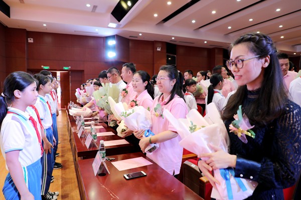 典禮在畢業(yè)生表演的詩朗誦《畢業(yè)之歌》中拉開了序幕。學(xué)生們精神飽滿,隨著舒緩的音樂,深情款款,道出了對老師的感恩,對母校的眷戀,對同學(xué)的不舍。為了表達對老師們的感謝,同學(xué)們給全體六年級老師獻上鮮花與祝福,全體學(xué)生齊聲高喊“老師謝謝您,老師您辛苦了”。飽含深情的聲音回蕩在大禮堂,寄托了孩子們對老師的感恩和不舍。