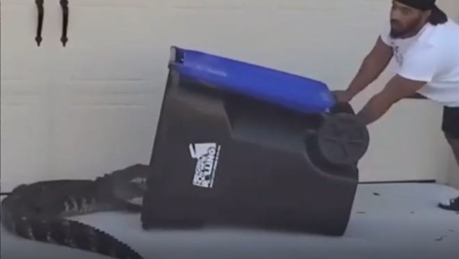 26歲的佛羅里達(dá)州男子尤金·博澤最近在美國上了熱搜,起因是他在家外面的空地發(fā)現(xiàn)了一條鱷魚,他小心翼翼地放平垃圾箱,一步步推向鱷魚,最后把鱷魚鏟進(jìn)了垃圾箱里,蓋上蓋子,成功捕獲鱷魚。