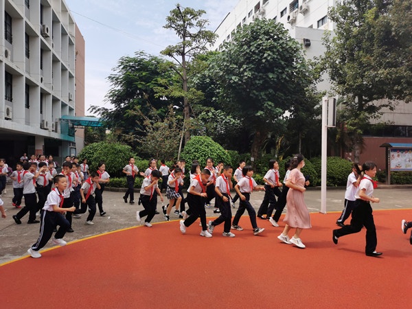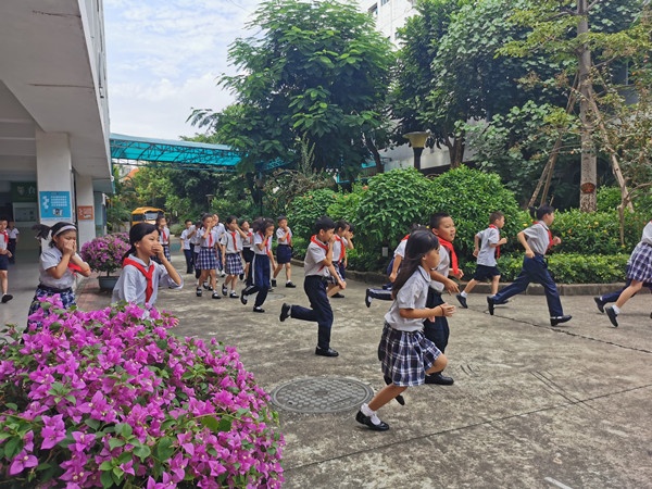 當(dāng)天下午1:40教學(xué)區(qū)、宿舍區(qū)各樓層鳴響警報(bào),全體進(jìn)入應(yīng)急狀態(tài)。同學(xué)們?cè)诶蠋煹闹敢?,立即彎腰、用手捂住口鼻,緊張有序地沿著逃生路線,迅速地向操場(chǎng)疏散撤離。從警報(bào)聲響起到最后一個(gè)同學(xué)來(lái)到球場(chǎng),共用時(shí)2分50秒,全體師生認(rèn)真參與。