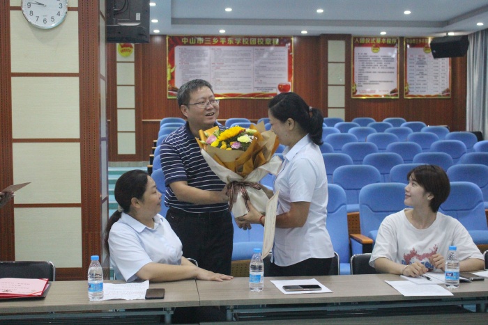 三鄉(xiāng)鎮(zhèn)黨委委員陳偉軍親自走到每一位獲獎教師代表身邊,送上榮譽證書和鮮花并致以節(jié)日的關(guān)懷和問候,陳委員暖心的舉動感動了在場的每一位教師。