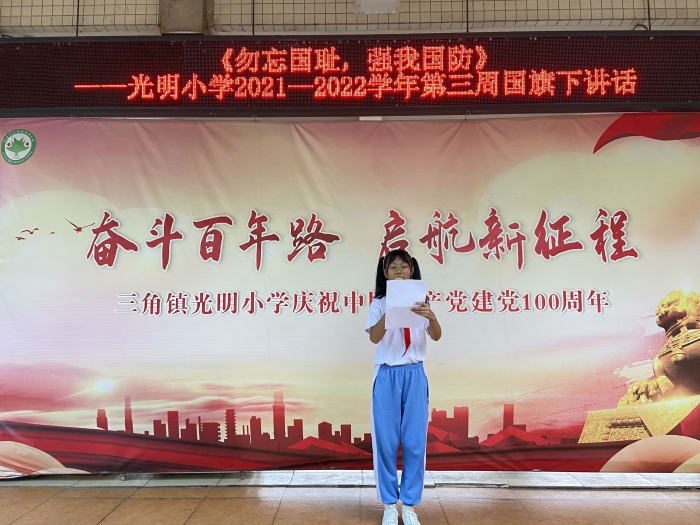 為紀(jì)念“九一八”事變90周年,進(jìn)一步弘揚(yáng)愛國主義精神,增強(qiáng)全體師生的國防觀念,9月18日上午,三角鎮(zhèn)光明小學(xué)組織全體師生開展紀(jì)念“九一八”主題教育活動?! ?/p>