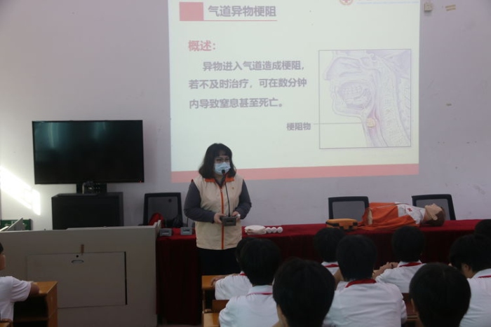 黎子丹老師通過將理論教學(xué)、案例講解和創(chuàng)設(shè)情景三者有機(jī)結(jié)合,認(rèn)真、耐心、仔細(xì)地幫助師生了解到了氣道異物梗阻、燒燙傷、中暑、鼻出血等一系列突發(fā)狀況在日常生活中出現(xiàn)的誘因、表現(xiàn)的病狀及緊急處理方法和預(yù)防措施,其講解過程清晰明了,語言通俗生動,引發(fā)了師生們濃厚的興趣,適時的問答環(huán)節(jié)更是讓現(xiàn)場氣氛保持活躍。