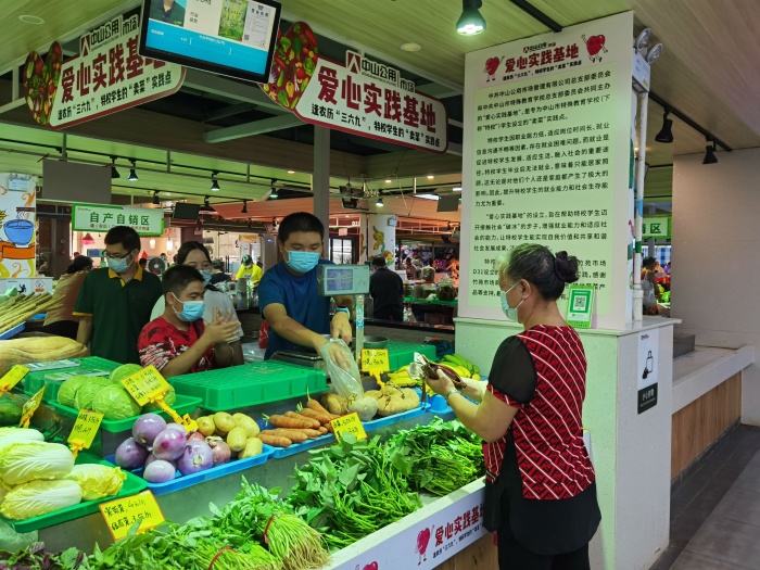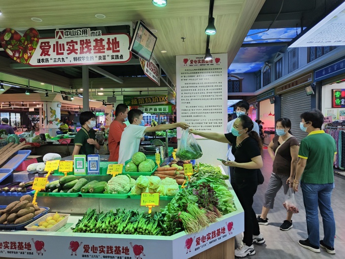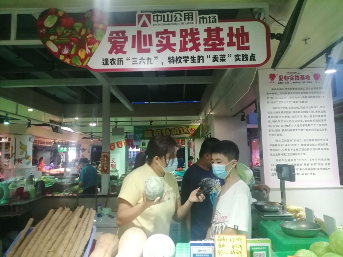 近期,竹苑市場(chǎng)一個(gè)普通的菜檔口受到了媒體和廣大市民的關(guān)注,因?yàn)椴藱n口的工作人員是來(lái)自中山市特殊教育學(xué)校培高年級(jí)的學(xué)生和畢業(yè)生們。每逢農(nóng)歷“三六九”上午,不管是工作日還是放假休息日,不管是烈日當(dāng)空還是狂風(fēng)暴雨,學(xué)校的黨員教師都會(huì)準(zhǔn)時(shí)帶學(xué)生到竹苑市場(chǎng)D31檔口開(kāi)展實(shí)踐活動(dòng)。他們熱情有禮地跟顧客打招呼、了解顧客需求,稱重收錢,整理菜品,忙得不亦樂(lè)乎,得到了市民群眾的好評(píng)。