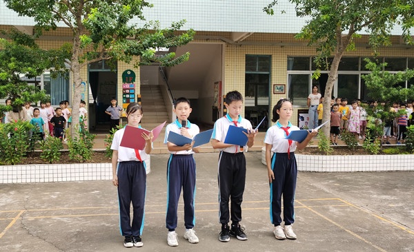 八點(diǎn)整,升國旗儀式正式開始。國旗護(hù)衛(wèi)隊(duì)邁著堅(jiān)定的步伐走向升旗臺(tái)。鮮艷的五星紅旗在激昂雄壯的國歌聲中冉冉升起、迎風(fēng)飄揚(yáng),全體師生肅立注目,齊唱國歌。國旗下,教務(wù)處主任吳偉卿激勵(lì)每一位學(xué)生要感恩國家的付出,好好學(xué)習(xí),豐富知識(shí),增長才干,長大后把祖國建設(shè)得更加強(qiáng)大。接著,六(1)班的四位同學(xué)以激情澎湃的詩朗誦《強(qiáng)國力量》向偉大的祖國致敬。他們把文字蘊(yùn)含的振奮人心、群情激昂、波瀾壯闊和自己內(nèi)心對(duì)偉大的黨和親愛的祖國的熱愛和自豪之情,展現(xiàn)得淋漓盡致,深入人心。