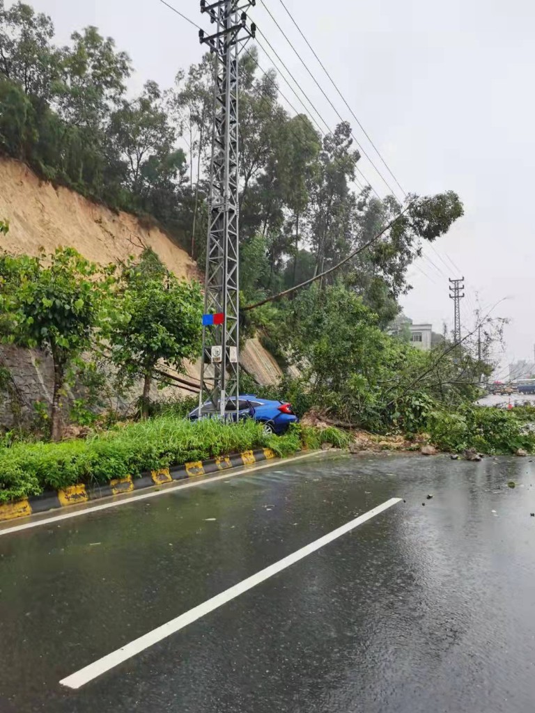 滑坡具體位置為國道G228線K6053+720處(神灣東華村珠海往中山方向路段),滑坡面積約300平方米,現(xiàn)場有一輛小汽車受損,沒有人員傷亡,該路段珠海往中山方向交通中斷,車輛通行利用中山往珠海方向進(jìn)行雙向通車。
