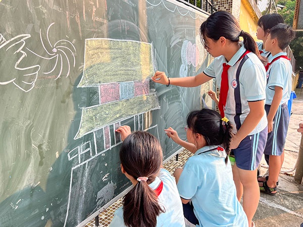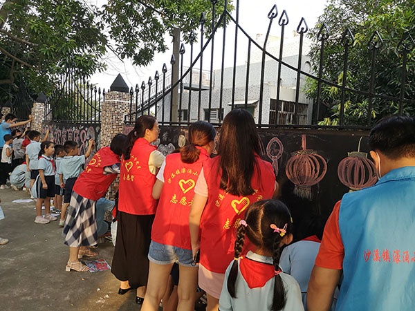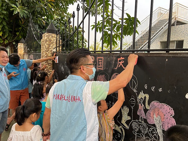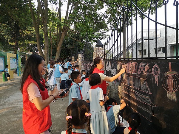 為使學(xué)生了解新中國(guó)建立的艱辛歷程和祖國(guó)建設(shè)取得的偉大成就,理解中國(guó)共產(chǎn)黨領(lǐng)導(dǎo)中國(guó)人民走社會(huì)主義道路是歷史的必然選擇,增強(qiáng)對(duì)偉大祖國(guó)、黨和人民的熱愛(ài),進(jìn)一步把愛(ài)國(guó)情感化為具體行動(dòng),立志為實(shí)現(xiàn)中華民族偉大復(fù)興作出貢獻(xiàn),在祖國(guó)母親生日到來(lái)之際,濠涌小學(xué)的黨員教師帶領(lǐng)家長(zhǎng)義工和學(xué)生一起布置起班級(jí)的涂鴉墻。小小巧手贊祖國(guó),大大畫(huà)筆繪山河,涂鴉墻在大家的共同努力下充滿(mǎn)了節(jié)日喜慶的色彩,為獻(xiàn)禮祖國(guó)涂上了濃墨重彩的一筆。
