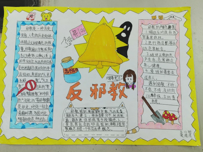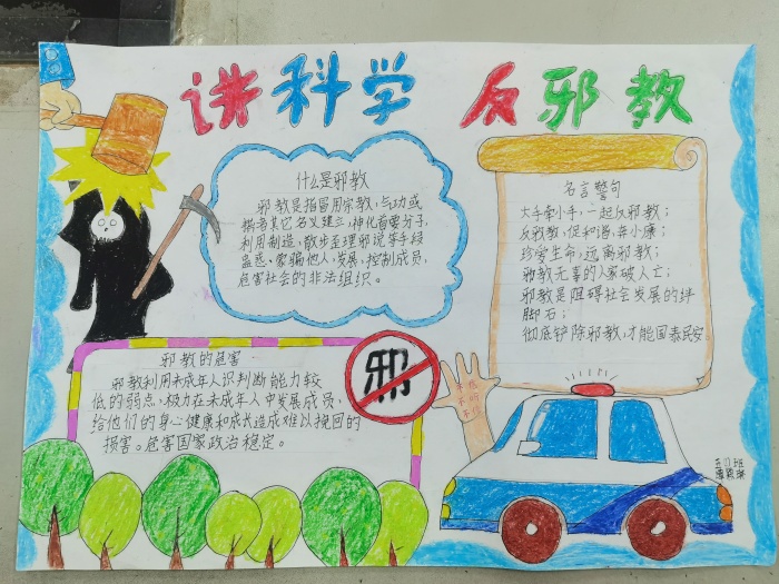除此以外,學(xué)校也組織開展了“講科學(xué),反邪教”手抄報創(chuàng)作活動。在學(xué)校德育處的安排下,學(xué)生利用國慶假期深入地了解了邪教的概念與危害等,并把學(xué)習(xí)到的知識融入到手抄報作品中。通過此次手抄報創(chuàng)作中,進(jìn)一步提升了學(xué)生認(rèn)識和抵制邪教的意識和能力。