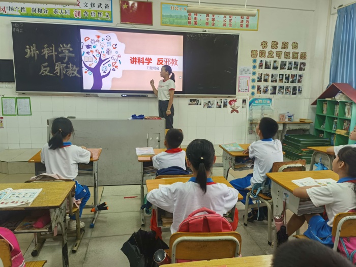 活動期間,三角小學(xué)各班開展學(xué)生“講科學(xué),反邪教”主題班會。班會上,班主任們利用學(xué)習(xí)強(qiáng)國播放了關(guān)于邪教的宣傳片,內(nèi)容主要涉及邪教的宣傳途徑,以及如何判別是否是邪教,讓學(xué)生們了解掌握有關(guān)邪教的知識。觀看視頻之后,分發(fā)了反邪教知識宣傳頁,讓學(xué)生通過宣傳頁對邪教有更清晰的認(rèn)知。同時,班主任們還講述了許多正值花季的學(xué)生因加入邪教而無辜受害,令人十分惋惜,告誡學(xué)生對邪教組織的反動宣傳,要做到不聽不看不信不傳。許多學(xué)生在班會課上積極發(fā)表自己對這些事例的看法以及對邪教的認(rèn)知,氣氛十分熱烈。