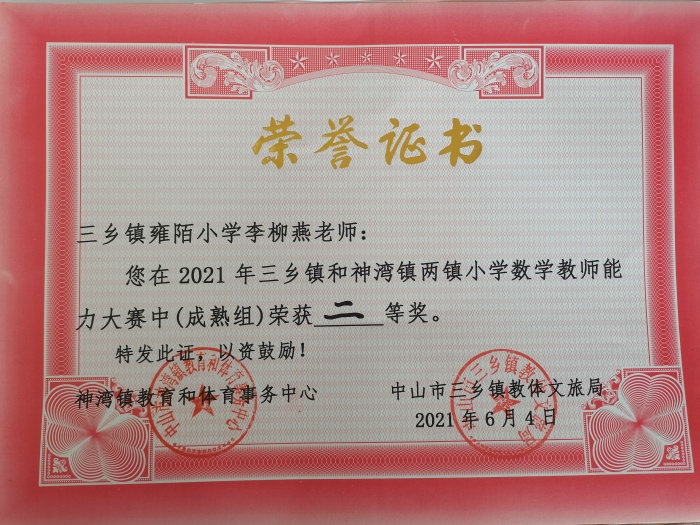10月14日早上,在神灣中心小學(xué)舉行了兩鎮(zhèn)小學(xué)數(shù)學(xué)教師素養(yǎng)大賽成熟組的決賽。李柳燕老師精心設(shè)計導(dǎo)入,善于發(fā)現(xiàn)并利用生活中的數(shù)學(xué)知識,層層遞進(jìn),聲情并茂,還融合了學(xué)科知識。最后以第三名的成績榮獲總決賽二等獎。