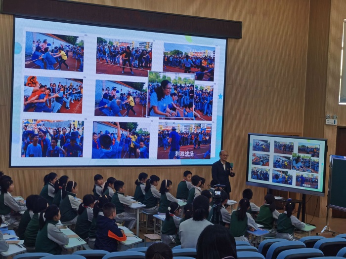 郭建平副校長(zhǎng)執(zhí)教的內(nèi)容是《作文技法訓(xùn)練 圓點(diǎn)法——記一次拔河比賽》。上課伊始,郭副校長(zhǎng)以微課引入,充分激發(fā)了學(xué)生的學(xué)習(xí)興趣,微課中典型的案例分析,讓學(xué)生馬上理解了作文技法——“圓點(diǎn)法”。教學(xué)過程中,郭副校長(zhǎng)還通過播放“南頭鎮(zhèn)中心小學(xué)校運(yùn)會(huì)拔河比賽”視頻,利用希沃白板5中的“放大鏡”引導(dǎo)學(xué)生認(rèn)真觀察,讓學(xué)生運(yùn)用圓點(diǎn)法嘗試選擇材料,圍繞“拔河比賽”中心點(diǎn)展開創(chuàng)作。