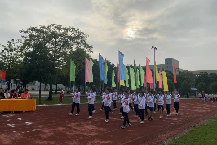 伴隨著歡快、昂揚的運動員進行曲,國旗隊、彩旗方陣以及各班運動員方陣依次有序入場。每個方陣以統(tǒng)一的服飾、矯健的步伐、飽滿的精神、響亮的口號進入田徑場,彰顯了師生積極向上的精神風(fēng)貌,也展示了一班一特色的風(fēng)采,更贏得了各位嘉賓及現(xiàn)場觀眾持久而熱烈的掌聲。進場完畢,全體成員一起升國旗,奏唱國歌。緊接著由張幸琪同學(xué)帶領(lǐng)同學(xué)們做手語操《國家》,由王境杭同學(xué)帶領(lǐng)同學(xué)們宣誓。