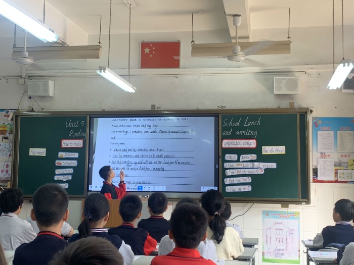 課堂教學(xué)展示環(huán)節(jié),黃彩敏、陳志樟兩位老師就五年級(jí)Unit 5 School Lunch 的Reading and Writing一課進(jìn)行了同課異構(gòu)教學(xué)展示。陳志樟老師教學(xué)設(shè)計(jì)新穎,運(yùn)用希沃多媒體使枯燥的閱讀與寫作課變得活潑生動(dòng)起來,師生互動(dòng)性好。黃彩敏老師課前準(zhǔn)備充分,利用自拍視頻,重點(diǎn)訓(xùn)練了學(xué)生提取關(guān)鍵信息的能力。兩位老師通過圖片識(shí)詞、識(shí)句,仿說句型,有效地把閱讀與寫作教學(xué)化繁為簡,由淺入深。課堂教學(xué)突出重點(diǎn),突破難點(diǎn),化抽象為具體、直觀展示知識(shí),讓學(xué)生在愉悅的氛圍中訓(xùn)練閱讀技巧,在開放的課堂下共享文化信息。